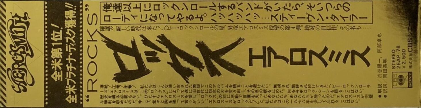ゴールドの下地に踊るスティーヴン・タイラーの大胆不敵なコメントが強烈。ロックスのフォントも迫力満点で、帯全体で名盤を演出。