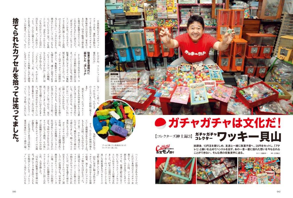 で今回、久々にモノ特集をやりたいと思ったものの、だいたいやり尽くしていて、アイデアが浮かばず、かといって同じことをやるのはモチベーションも上がらず、そこで思いついたのがコレクターにフォーカスを当てた特集でした。これははまだやっていなかったはずだと思い、いろいろなコレクターをリストアップするところから作業が始まりました。とはいいつつも、冷静に考えたら本誌の回りには結構コレクター思しき人物はいて、あの人もそうだ、この人もそうだ。という感じで声をかけつつ、新規で取材オファーをしていくと言う形でラインナップが決まっていきました。ガチャコレクターのワッキー貝山さんは1年くらい前にわざわざ編集部まできていただき話をさせていただいたことがありました。