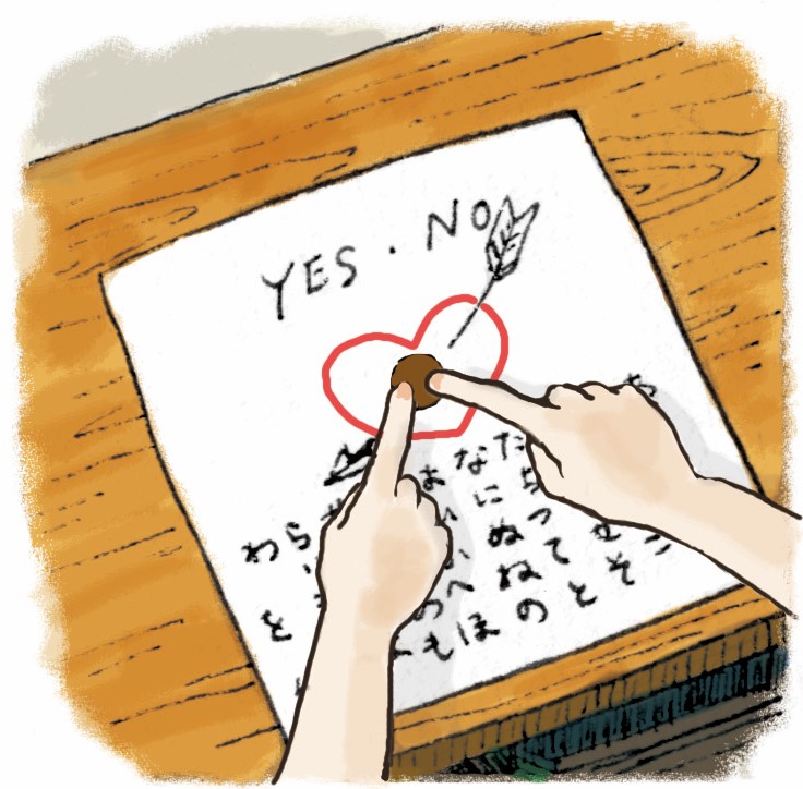 こっくりさんの“恋愛専科”版とでもいうような占い遊び。やっていたのはほぼ女子。男子は冷やかし専門。2人~4人ぐらいで集まり、紙に五十音とYES/NO、0~9の文字、それにハートマークを書いて準備OK。ハートマークの上に立てた鉛筆を参加者全員で握り、「キューピットさま、○○くんが好きな人は誰ですか?」とか訊くと、手が勝手に文字の方向に動いて…。「手に力入れてんでしょ?」とか茶化したりするとあとで呪われるとか、キューピットさまなのに怖い言われもあった。