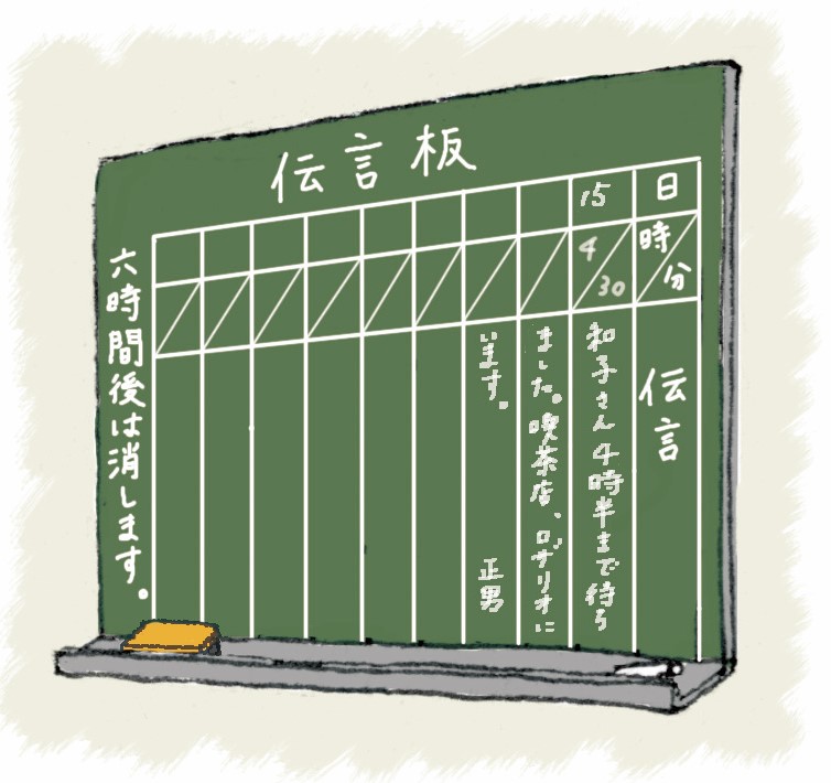 末期は構内の落とし物を書き記すぐらいのものとなり、今はほとんどその姿をみかけなくなた駅の伝言板。漫画『シティーハンター』で主人公が依頼人とのやりとりをする場所として使われていた新宿駅東口にも、もちろん今はない。かつては待ち合わせ場所の連絡、他人からの冷やかし含む相合い傘、「いつまでも好き!」など公園の落書きレベルでも恋人たちに活用されていた。野口五郎『私鉄沿線』が聴きたくなる。