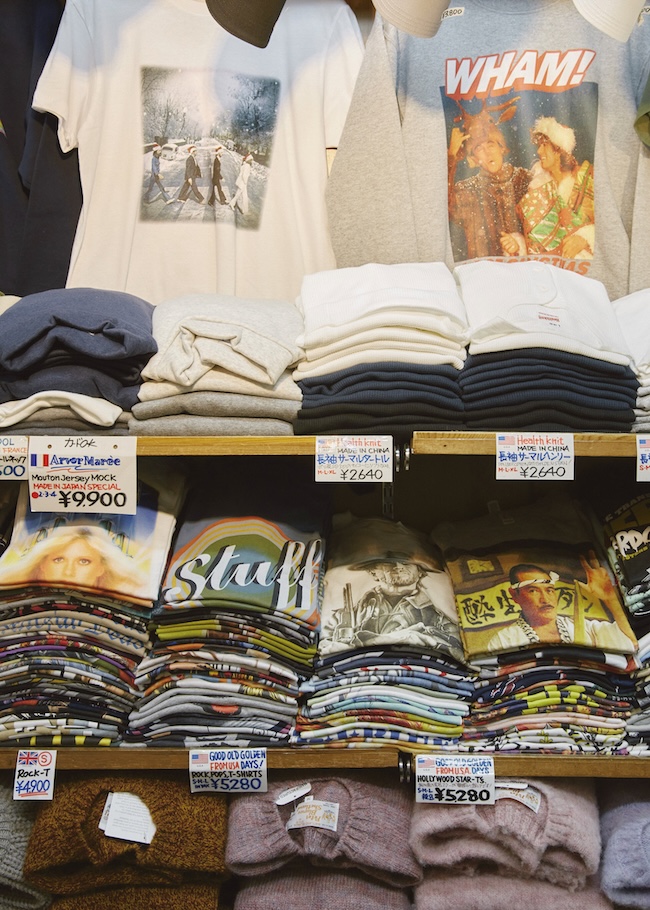 ここがただのアメカジ店でないことが、一目でうかがえるラック。バンドTだけじゃない、映画モノに、古きよきサーフブランドの復刻Tシャツなども輸入
